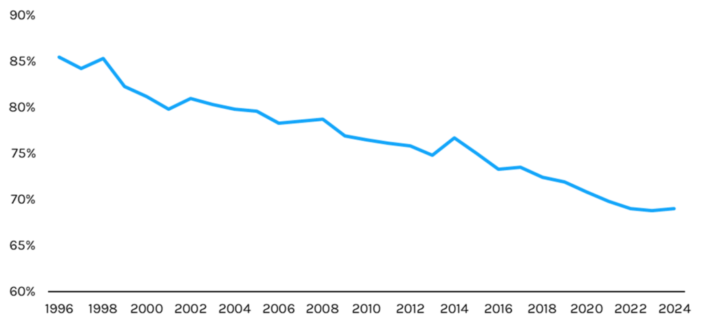 Exhibit 2: Share of Private Sector Employees Eligible for Health Insurance Who Are Enrolled in Health Insurance, 1996-2024 (%)