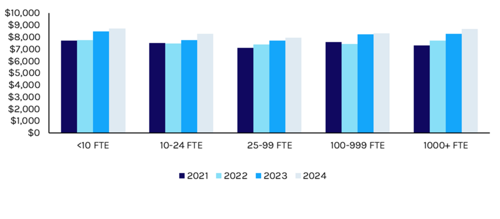 The impact of rising premiums has varied based on employer size, with larger employers more easily able to absorb higher costs compared to smaller firms (see Exhibit 3). We believe this positions employers in the ~50-250 full-time employee (FTE) band to generate the most meaningful cost savings by adopting an alternative employee health benefit package.