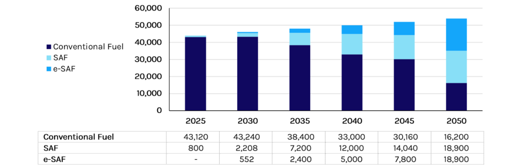 EU aviation fuel demand is projected to grow from approximately 44 million tonnes today to around 54 million tonnes by 2050. The combination of rising demand and expanding mandates requires that SAF and e-SAF supply volumes increase sharply over the next two decades.