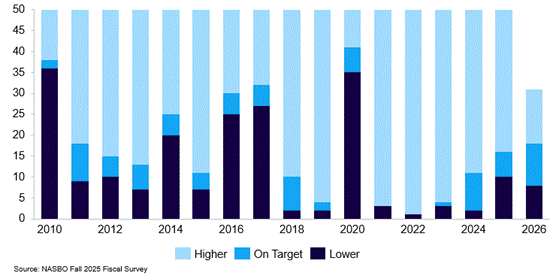 It appears that conditions are changing in the current fiscal year, as states are reporting softer-than-expected monthly tax collections. Thirty-four states have released preliminary revenue estimates for the first couple of months of FY26, and eight are already underperforming; 10 states report collections are on target. Only 13 states (38%) have indicated that collections in FY26 are better than expected.