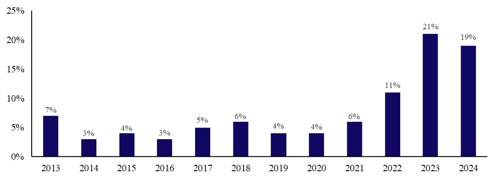 Extreme weather disasters have driven carriers to rapidly increase premium rates to ensure rate adequacy. According to filings from the Texas Department of Insurance (TDI), the average rate change for homeowners’ insurance hovered around 3% from 2014 to 2016. Recent rate increases have been more dramatic, averaging 11% in 2022, 21% in 2023, and 19% in 2024. Insurify estimates that Texas will be the fifth-most expensive state for home insurance in 2025, with homeowners paying an average annual premium of $6,522. Increasing premiums have raised scrutiny in the Texas legislature and at TDI, which we expect to continue in the near term.