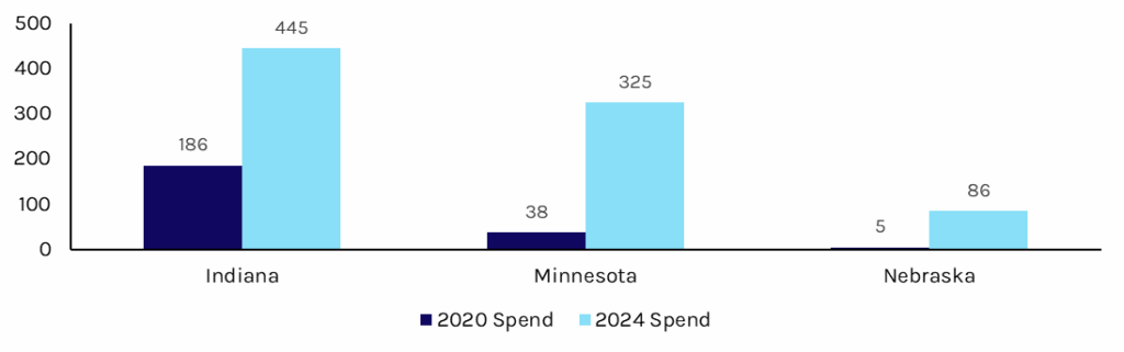 Indiana introduced a state-set fee schedule for ABA in 2024, moving away from the original rate methodology that reimbursed 40% of provider-billed charges. The state introduced another rate cut effective April 2026 to better align rates with the national average. Similarly, Nebraska has introduced recent rate cuts in response to rising expenditures, although the new rates remain above the national average (see Exhibit 2).