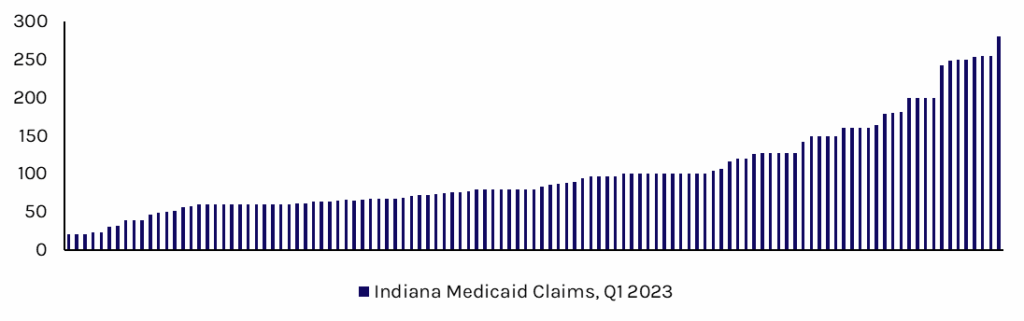 Capstone believes that state actions tightening utilization and reducing reimbursement rates are largely targeted at bad actors in the market or attempts to reset rates to the national average. Recent state actions do not indicate a widespread sentiment toward the ABA industry overall, as a few bad actors whose billing practices distorted the market have generated much of the negative press surrounding the ABA. Indiana Medicaid serves as a prominent example (see Exhibit 3), with large variations in Medicaid claims during Q1 2023, as the percentage of billed charges methodology resulted in a handful of bad actors that submitted inflated claims to secure high reimbursements. Notably, many providers continued billing at standard rates, resulting in minimal to no impact on rates once the state switched over to a fee schedule.